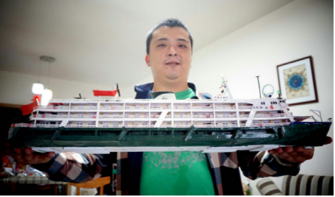 ▲?長江船舶愛好者王軒和他制作的“江渝4”號客輪模型。此船換色改名后,現收藏于奉節縣詩城博物館